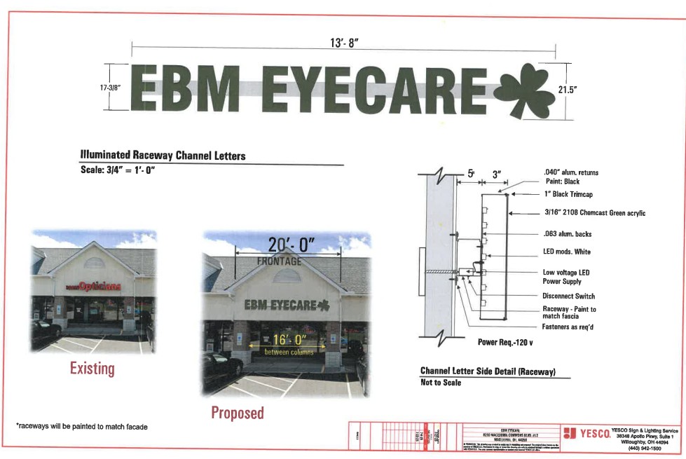 The commission approved green signage for EBM Eye Care taking over unit 52 at Macedonia Commons, previously occupied by Paris Opticians. The green color was added to the shopping center’s approved palette after the applicant met height and trim specifications.