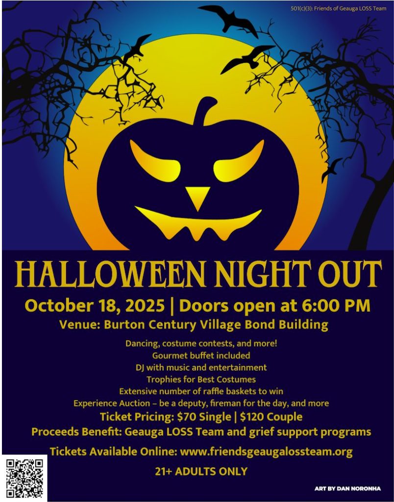 The Geauga County Sheriff’s LOSS Team will hold its Annual Halloween Night Out Fundraiser, with all proceeds supporting the team’s critical work. The LOSS Team provides 24/7 support to individuals and families affected by sudden or traumatic events, working alongside first responders to offer comfort, resources and hope during crises ranging from unexpected deaths to community-wide incidents.
