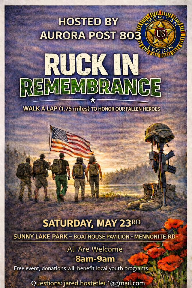 AURORA, Ohio – American Legion Post 803 will host the Ruck in Remembrance on Saturday, May 23, 2026, at Sunny Lake Park to honor the nation’s fallen heroes. The event, which begins at 8 a.m. at the Boathouse Pavilion, invites the Aurora community to walk or ruck a lap around the scenic lake in a display of fellowship and gratitude. Participation is free and open to the public, with all donations directly benefiting American Legion local youth programs.