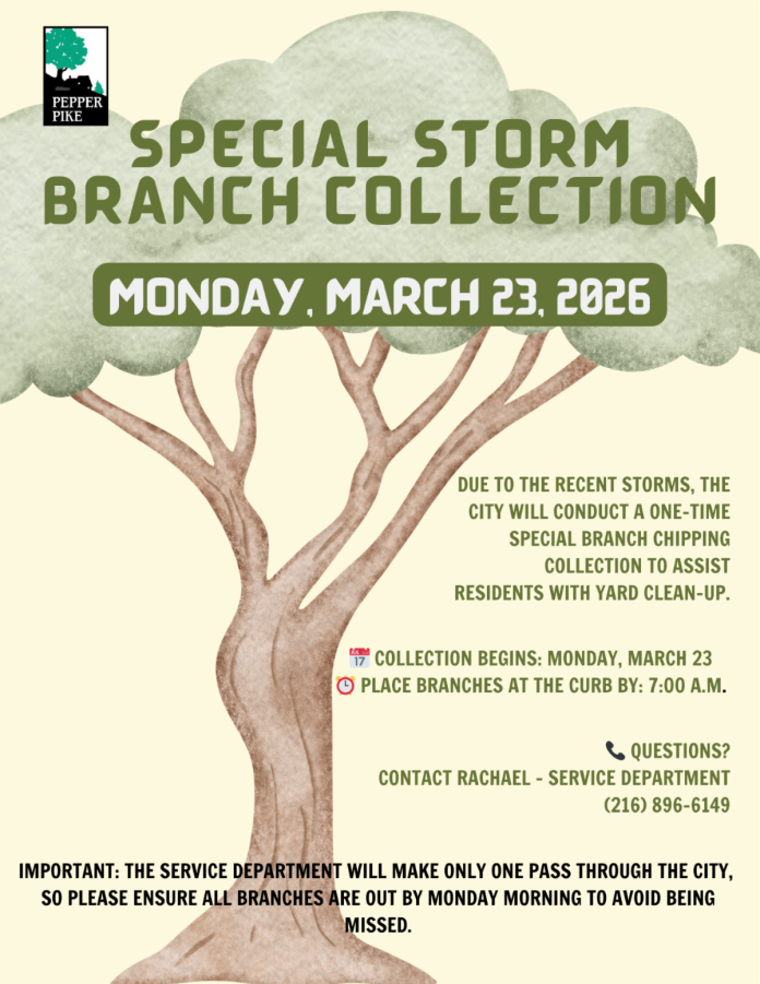 PEPPER PIKE, Ohio – Mayor Richard M. Bain and the City of Pepper Pike Service Department have announced a special, one-time branch chipping collection to assist residents with the aftermath of recent severe weather. This emergency service is designed to help the community efficiently clear debris from their properties. The collection is scheduled to begin promptly this Monday, March 23, and crews will make only a single pass through the city to ensure all affected areas are serviced as quickly as possible.